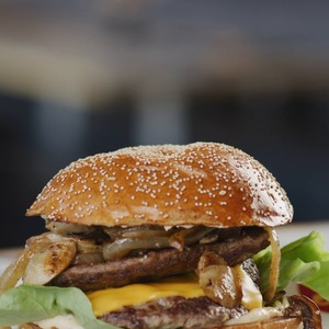 Burger JB Champignons mit 125g Patty, JB Sauce, frisch gegrillten Champignons und Zwiebeln und Käse